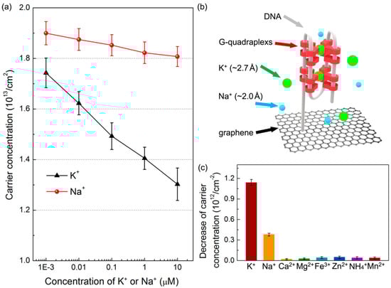 The performance of graphene biosensors functionalized with DNA probes for selective K+ ion recognition was investigated, as presented in Figure 4a. The KCl or NaCl solution with 1× TE buffer was dropped on the device in sequence from 1 nM to 10 μM for reaction with DNA molecules. In this dynamic range (1 nM–10 μM ion concentrations), the carrier concentration linearly decreases 25.7% (from 1.75 × 1013 to 1.30 × 1013/cm2) when the K+ ion is the target. In contrast, it decreases only 4.7% (from 1.90 × 1013 to 1.81 × 1013/cm2) for sensing Na+ ions, demonstrating that our graphene sensing platform based on the Van der Pauw measurements provides a high sensitivity and distinct selectivity for the detection of K+ ions. Compared to other graphene-based devices [43,44,45], a lower detection limit (≈1 nM) can be achieved by our devices. For an example, the limit of detection for 10 nM K+ ions was reported using mechanically exfoliated graphene FETs [24]. The high specificity of our devices (≈4 times) can be attributed to the spatial compatibility between the central cavity of guanine-quadruplexes and the potassium ion radius, as schematically illustrated in Figure 4b. The interfacial space between two G-quadruplexes is in the range of 2.4–3.4 Å [46,47,48,49]. As this structure coordinates K+ ions (diameter: ≈2.7 Å), a bipyramidal antiprismatic arrangement can be implemented accordingly [48]. In order to further demonstrate the device availability in the complex situation, other cations commonly found in the human body were also employed to test our devices. In Figure 4c, obviously, the decreased amount of carrier concentration for K+ ions was much larger than other interference ions, even the added concentration of interference ions (10 nM) is 10 times higher than that of K+ ions (1 nM). The signal deviation for K+ ions is 3.2 and 16.3 times higher than that of Na+ and other cations (including Ca2+, Mg2+, Fe3+, Zn2+, NH4+, and Mn2+), respectively. The results confirm that the proposed graphene biosensor not only shows a high sensitivity, but also has a pronounced selectivity towards K+ ions.