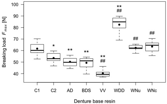 Boxplots of the breaking loads (Fmax) of the tested resins. Significant differences (p < 0.05) with respect to control group C1 are indicated by *, highly significant differences (p < 0.01) with respect to control group C1 are indicated by **, and ## indicates highly significant differences (p < 0.01) with respect to control group C2.