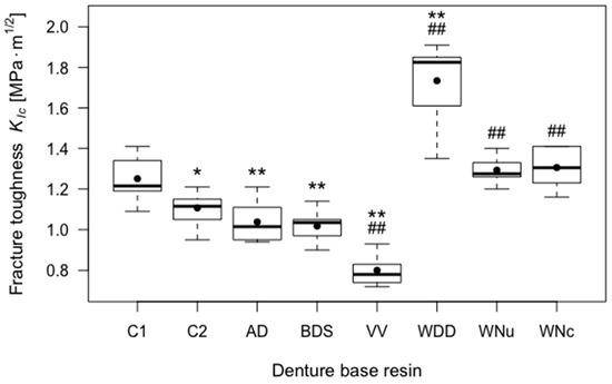 Boxplots of the fracture toughness (KIc) of tested resins. Significant differences (p < 0.05) with respect to control group C1 are indicated by *, highly significant differences (p < 0.01) with respect to control group C1 are indicated by **, and ## indicates highly significant differences (p < 0.01) with respect to control group C2.