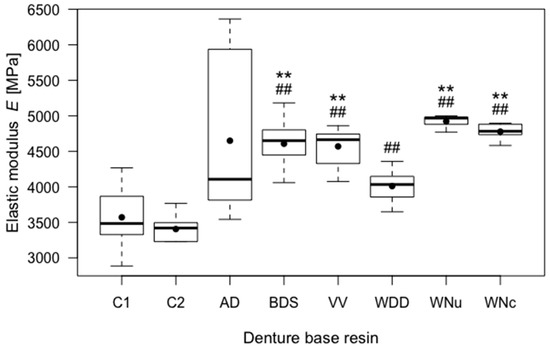 Boxplots of the elastic moduli (E) of the tested resins. ** indicates highly significant differences (p < 0.01) with respect to control group C1, ## indicates highly significant differences (p < 0.01) with respect to control group C2.