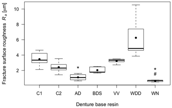 Boxplots of the fracture surface roughness (Ra) of the tested resins. Significant differences (p < 0.05) with respect to control group C1 are indicated by *, and significant differences (p < 0.05) with respect to control group C2 are indicated by #.