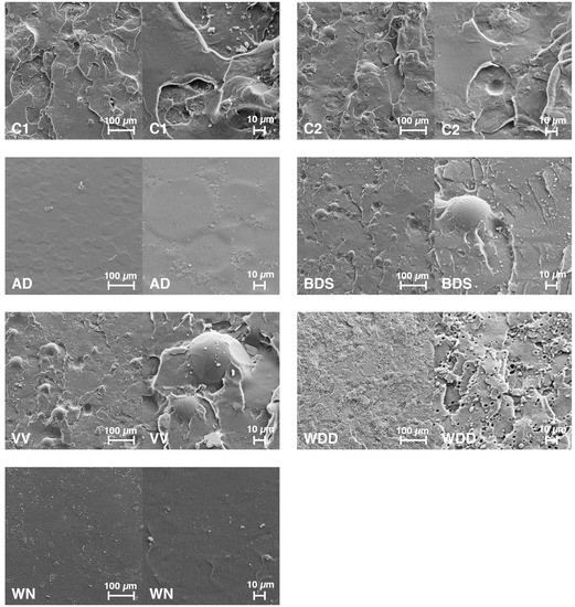 The SEM images (Figure 6) nicely illustrate the differences in fracture surface textures between the various resins. The WN and AD specimen fracture surfaces present with very even and smooth surfaces without visible particles. BDS, VV, C1, and C2 surfaces are visibly rougher and seem to be streaked with coarse clods of different size. In addition, the fractures reveal spherical particles with diameters of around 40 μm, probably PMMA microspheres in BDS, VV, and C2 specimens, with apparently different microsphere content. BDS resin seems to have the highest microsphere content, followed by VV and then C2. WDD resin, on the other hand, presents a rather fine-granular fracture surface texture, and at a higher magnification seems to be interfused with small oval cavities, which might either represent micro-pores or perhaps residues of soluble particles washed out during the purifying procedure (application of residue-free aerosol) necessary for preparing the specimens for SEM imaging.