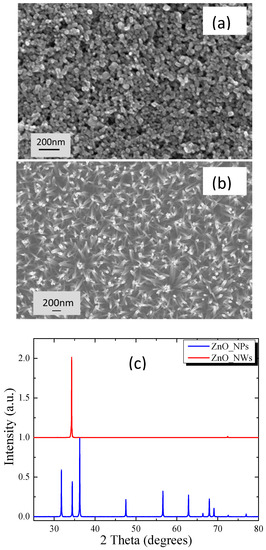 SEM images of: (a) ZnO nanoparticle film; and (b) a ZnO nanowire film; and (c) XRD patterns of a ZnO nanoparticle and a nanowire film.