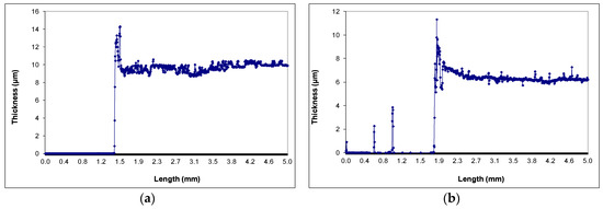 Figure 2 shows step profilometer images illustrating the difference in roughness between nanowire and nanoparticle films. The thickness of nanoparticle and nanowire films is also shown in this figure. It can be observed that the film thickness of the nanoparticle films (Figure 2a) is approximately 10 μm. NW films of varying thickness were prepared and tested, by modifying the NW growth conditions. The NW array shown in Figure 2b has been prepared after renewing the nutrient solution two extra times after the initial growth.