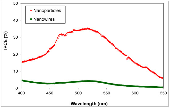 IPCE values of nanoparticle-based and nanowire-based DSSCs as a function of wavelength.