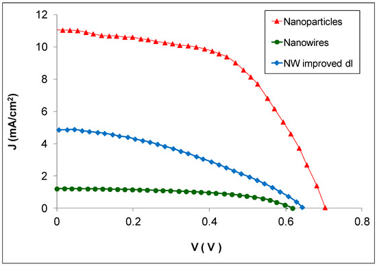 J-V characteristics of ZnO nanoparticle, nanowire and nanowire with improved dye loading DSSCs.