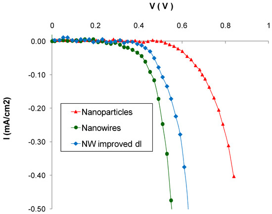 As mentioned in Section 2, one of the causes of high dark current is the presence of semiconductor sites without dye adsorbed, that come in direct contact with the electrolyte. From Figure 3 it is apparent that dye adsorption in nanowire-based cells is not as successful as in nanoparticle ones and that is probably one of the reasons for the higher dark current of nanowire-based DSSCs. In addition, due to the porous nature of nanowire films, it is possible that there are more pathways for the electrolyte to come into contact with the glass substrate and cause charge recombination, as will be discussed below [44].