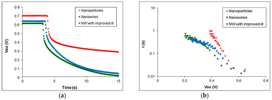 OCVD measurements can be used to determine electron recombination rates and ultimately electron lifetimes in DSSCs [45,46]. OCVD experiments measure the recombination rate of electrons injected into the conduction band of the semiconductor. Thus, the photovoltage decay measured reflects the decrease of electron concentration at the conductive glass surface, caused by charge recombination. Figure 7a shows the OCVD decay curves of typical nanoparticle and nanowire-based devices. It is apparent that the rate of open-circuit voltage decay is higher for NW devices than for nanoparticle ones. The electron lifetime with respect to the open-circuit voltage (calculated according to Equation (3)) is presented in Figure 7b and it was found to be higher for nanoparticle-based DSSCs than for nanowire cells. The results shown in Figure 7 indicate that there is higher electron recombination for nanowire DSSCs than for nanoparticle ones. It could be attributed to poor dye loading and possibly to contact of the conductive substrate with the electrolyte, as in the case of dark current.