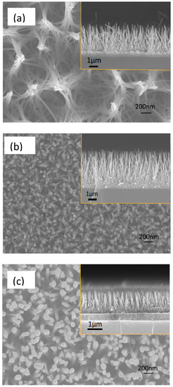 FE-SEM images of ZnO NW arrays used to optimize the dye loading conditions. NWs in (a–c) have average diameter 20–25, 30–40 and 80–100 nm, respectively.