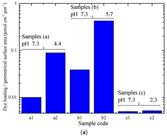 In the case of very acidic dye solutions (pH 2.3) it was observed that there is rapid (within a few hours) degradation of the dye solution in the presence of ZnO films. Dye degradation in ZnO films occurs due to protons originating from the dye interacting with the ZnO surface and causing the dissolution of Zn surface atoms [50]. The Zn atoms then react with the protons from the dye, forming Zn+2/dye complexes. This leads to the formation of inactive dye molecules which limit charge carrier injection and reduce the efficiency of the cells. The dissolution of Zn atoms depends on several factors, such as the dye concentration, the sensitization time and the pH of the dye solution [49]. Thus, to achieve optimum dye loading and efficiency, the pH of the dye should be lower than the pHPZC of the film, but not so low that it causes dye degradation. It should also be noted that the samples of type (c) had lower dye loading at pH 7.3 than the samples of the other two types. This illustrates the effect of film morphology on the dye loading of the films. It can be observed from Figure 8 that the samples of type (c) had NWs with a diameter up to five times as large as that of the two other sample types. The higher diameter of the NWs leads to the formation of films with lower surface area for dye adsorption and, consequently, lower dye loading.