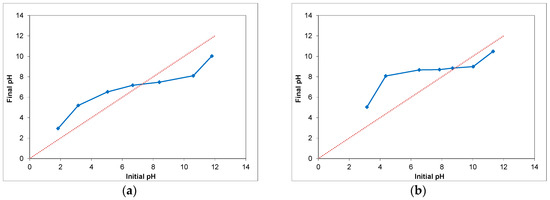 To test this hypothesis, the pH of the point of zero charge (pHPZC) of ZnO nanowire films was determined as described in Section 2.3 and compared to the pHPZC of ZnO nanoparticle films. The values of the final against the initial pH are shown in Figure 10 and the pH at which the curve crosses the line of pHfinal = pHinitial is the pH of the point of zero charge of the film. In this case, the pHPZC of ZnO nanowires (Figure 8a) was found in the range of 6.7–7.2 (the range represents the results of pHPZC measurements in different samples). The pHPZC of ZnO nanoparticles was found to be approximately 8.9 (Figure 8b), which agrees with corresponding results reported in the literature [49].