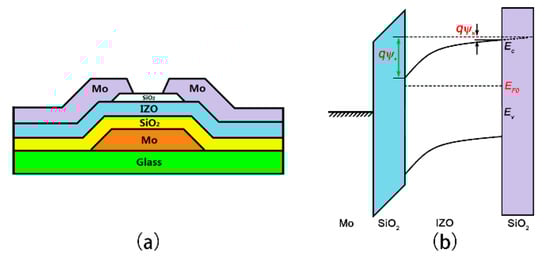 (a) Cross-sectional view of indium zinc oxide thin-film transistors (IZO TFTs) with inverted staggered bottom gate structure; (b) energy band diagram along the thin-film depth direction of IZO TFTs.