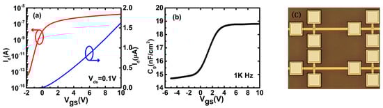 Experimental data of IZO TFTs (W/L = 20 μm/10 μm). (a) Transfer characteristics; (b) Cg–Vgs characteristics; (c) The micrograph of the devices.