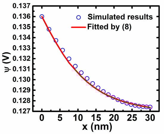 As a result, Poisson’s equation of (A5) can be numerically solved under the boundary conditions of (A6) by using the conventional finite difference method. Figure A1 shows the numerical results of the potential along the depth direction (x) with the extracted values of Nbt(E) at the condition of Vgs = 1.0 V. It is shown that the numerical results of potential distribution may be reproduced well by (8). It is further found that the numerical results of potential distribution at other Vgs can also be fitted well by (8) with different x0. Similarly, analytical complex exponential distributions of potential are also obtained by only taking into account either the free electrons [23] or the trapped electrons [12] in Poisson’s equation. In brief, Equation (8) may be a reasonable approximation for the potential distribution to achieve a good tradeoff between accuracy and simplicity.