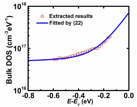Figure 7 shows the bulk density of states profile extracted from Equation (20). It is observed that the bulk DOS distribution slowly increases with the increase of the energy far from EC, while it quickly increases with the increase of energy close to EC at the exponent coordinate. It is found that the bulk DOS may be a superposition of exponential deep states and exponential tail states, i.e.,