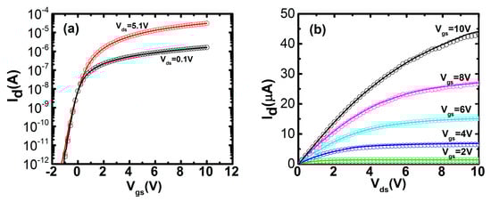 Experimental data (symbols) and simulated results (solid lines) of IZO TFTs with W/L = 20 μm/10 μm. (a) Transfer characteristics; (b) output characteristics.