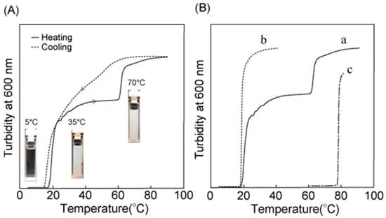 (A) Temperature dependence of the turbidity at 600 nm for poly(NAAMe53-b-NAGMe240-b-NAAMe53) aqueous solution (0.25 wt %). Heating and cooling rates are constant at 1 °C min−1. The insets show photographs of the solution that were acquired at the indicated temperatures in the heating process. (B) Comparison of the turbidity curves in the heating process between the triblock copolymer poly(NAAMen-b-NAGMe2m-b-NAAMen) (a) and the corresponding homopolymers of poly(NAAMe) (b) and poly(NAGMe240) (macro-initiator) (c).