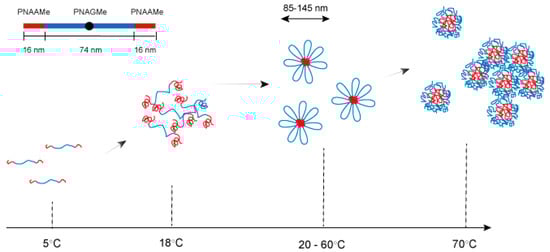 Plausible model for the thermo-responsive transitions of poly(NAAMe53-b-NAGMe240-b-NAAMe53) through various aggregation states containing flower-like micelle formation.