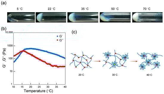 The self-assembly process of the triblock copolymer was further investigated in concentrated aqueous solutions (above 10 wt %). In the case of poly(NAAMe18-b-NAGMe240-b-NAAMe18) with a short poly(NAAMe) block, no notable gelation occurred even at a concentration of 30 wt %, while other two copolymers with longer poly(NAAMe) block formed hydrogels at 30 wt %, above 17 °C. Figure 4a displays pictures of poly(NAAMe53-b-NAGMe240-b-NAAMe53), a representative triblock copolymer, solution (30 wt %) at various temperatures. Above the 1st LCST transition of this triblock copolymer (18 °C), the transparent sol is transformed to the milk-white gel (22–35 °C). Upon further heating up to 50 °C, the gel is found to partially become a turbid sol and it turns again to a stiff turbid gel over the second LCST transition (70 °C). The observed fluid sol state between 35 °C and 50 °C strongly suggests the formation of a flower-like micelle structure. The rheological measurement performed for the same polymer solution (30 wt %) also supports the above discussion. Figure 4b shows temperature dependence of the storage (G’) and the loss (G”) moduli under the conditions of a frequency of 6 rad s−1 and 1% strain. Below 15 °C (close to the 1st LCST), the G” value is higher than that of G’, meaning that the polymer solution is in a sol state. Upon elevating temperature, the G’ value becomes reversely higher than that of G”, suggesting being in a gel state through a sol-to-gel transition. Over around 22 °C, the G’ value is found to decrease gradually, probably due to decrease in the cross-linking density in the hydrogel network although G’ always maintains the higher values than those of G” up to 40 °C. From these results it can be concluded that after the first LCST transition (15–20 °C) the hydrophobized poly(NAAMe) segments interact over each other forming a network structure with the dense cross-linking, and further increase in temperature enhances dehydration of the polymer segments and rearrangement of the cross-linking points to form a flower-like micelle as pictured in Figure 4c.