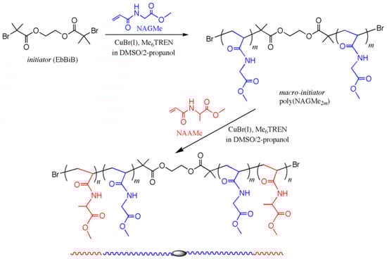 Synthetic route for the triblock copolymers poly(NAAMen-b-NAGMe2m-b-NAAMen) by using an atom transfer radical polymerization (ATRP) method.