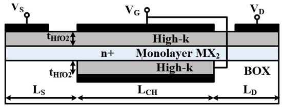 In addition to the channel materials, the oxides play an important role to improve the performances of the devices [29]. Increment of the dielectric constant and reduction of its thickness can reduce the subthreshold swing and increase the gate controllability. In our simulations, the dielectric constant is kept at 25 with its thickness of 2.0 nm without further optimization. The is the value of high-κ material like HfO2. The schematics of JLFET in the double-gate (DG) configuration with a monolayer MX2 channel are shown in Figure 1. The lengths of source and drain are 5 nm. JLFET consists of a uniformly doped source, drain, and channel with a molar fraction equal to corresponding to the doping level about . In the model, the metallic contacts to the source and drain are overlooked. It may be included in a device model as shown by Agarwal et al. [3]. The contact resistance will mainly decrease the ON-state current. It may reduce the current by one order when the resistance increases from 10 to 1000 . This will thus increase the intrinsic delay of the devices.
