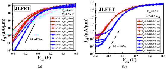 The transfer characteristics of JLFET with different lengths of channel and different bandgap for fixed (a) and (b), respectively.