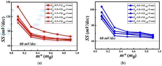 The versus the electron effective mass () and the bandgap at channel length of 3 nm and 5 nm are shown in Figure 3. The thermionic limit of 60 is shown by the dot-dashed horizontal line. Both devices approach to the thermonic limit when the effective mass is increased, which means that the controllability of the gate is better with the larger carrier effective mass. It is natural to achieve lower when the effective mass is larger. This is because the tunneling current is the main source to worsen the . It is reduced when the effective mass is increased because of the reduction of the current.
