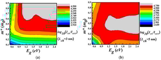 To further estimate the FOMs of 2D JLFET, we compute the ratio where denotes the in the OFF state for the n-type FETs ( where is the supply voltage) and is the current in the ON state (). According to the ITRS this ratio has to be larger than 104 to ensure a good balance between the static and dynamic power consumption. The ON-OFF ratio with different and bandgap were shown in Figure 4a,b. The “L”-shape contour line with its leg on the bandgap side means that the ratio is insensitive the bandgap when it is about 1.0 for both channel length. However, when it is smaller than the 1.0 , it is insensitive to the effective mass. The large can be achieved when the effective mass is between 0.6 and 0.8 , while this value is reduced to 0.4–0.6 when the channel length is increased from 3 nm to 5 nm. When compared with the prediction of ITRS for 2026 LOP devices, the requirement of the ratio is twice as the highest achievable ratio within our parameter space. It is at the same order in UTB Si devices as shown by Alam et al. [21]. As shown by recent work [11], this effective channel can be down to 1.0 nm, while the ON-OFF ratio can be larger than 104.