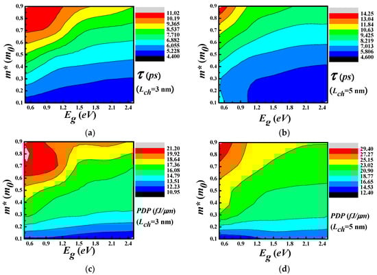 The denotes the switching energy used in logic devices. During this calculation, the is set to , which is the same as the ITRS requirement for the HP applications. Both the and of the different devices with channel length of 3 nm and 5 nm are functions of the bandgap and effective masses, as shown in Figure 5. The minimum time delay achievable is about 5.0 with respect to most of the bandgap (). It is a monotonic decrease function of the effective mass as shown in (a) and (b) in the Figure 5. This gives us the flexibility to choose suitable materials. However, the delay is several times larger than the requirement of the HP devices in ITRS2.0. Reduction of the delay requires larger ON-state current, as shown in the above equation, so that the charging process can be faster. Increasing the current can be realized by a higher doping level or using a multilayer of 2D materials.