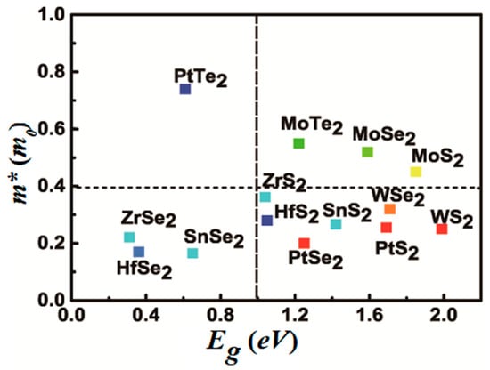 With respect to these results, we next figure out the possible material candidates for channel materials in logic FETs, MX2 covered a wide range of bandgap and effective carrier masses. We plot a chart of the electron effective masses versus the bandgap predicted by DFT [30] in Figure 6. For the anisotropic materials, we use the smaller effective mass, since it determines the for the current transportation in this direction as argued above. The horizontal and vertical dashed line in Figure 6 denote the effective electron mass of 0.4 and bandgap 1.0. With the above 0.4 , the can be reduced to about 70 for a 5nm channel length and 80 for 3 nm., the ON-OFF ratio can reach 5 × 104 when the bandgap is above 0.9 even when the channel length is only 3 nm. With these material parameters, the delay can be reduced to 7 and the PDP is below 18 . From the consideration above, we can see only three compounds locate at the upper-right corner of the chart. They are all molybdenum dicholgenides compounds. These compounds are promising when used in the devices with channel length below 5 nm. For the others, it is difficult to balance the different devices performances. Although PtSe2 and HfSe2 have ultra-small effective masses [31] that were promising for devices working in the long channel, they are not ideal to work in the ballistic transport regions. As the in JLFET is limited by the thermionic emission of the electrons in the source, it is impossible for JLFET to go beyond that. In order to suppress the thermionic limitation of the devices, a new concept is needed, such as the band-to-band tunneling mechanism in 2D materials [5,31] or control of the source and channel region separately, as shown very recently [32].