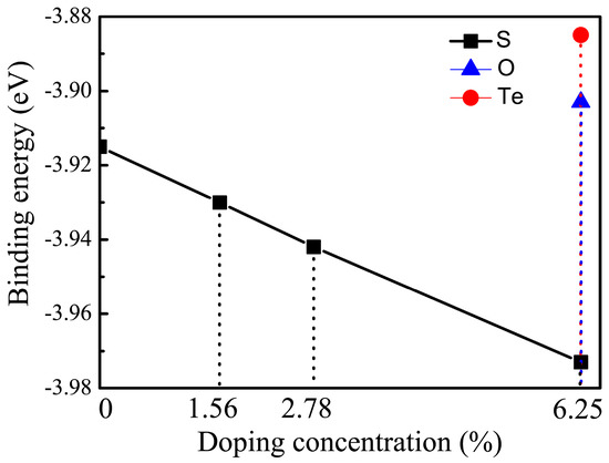 It can be seen in Figure 3 that the S-doping system is energetically the most stable. Hence, we focused on S to study the doping concentration effects on optoelectronic properties. We also investigated the concentration effects of O and Te at 1.56%, 2.78% and 6.25%. The results for O and Te exhibit a similar trend to S. Moreover, S-doping sufficiently reflected the effect of doping concentration on the optoelectronic properties of monolayer CSe. Thus, we have carried out detailed discussions about the concentration effect of S.