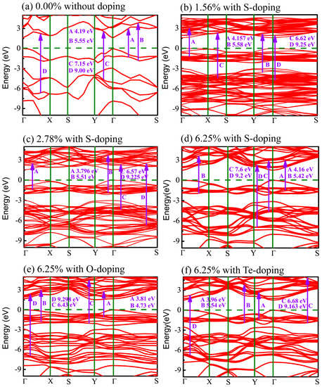 Band structure of monolayer CSe: (a) pristine monolayer; (b–d) S-doping at concentrations of 1.56%, 2.78%, and 6.25%, respectively; (e) O-doping at 6.25%; (f) Te-doping at 6.25%. Dashed lines specify Fermi level. Possible optical interband transitions are shown by guiding arrows.