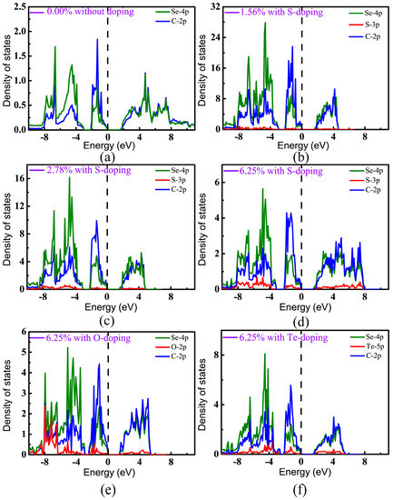 In order to distinguish the contributions of different orbitals to the band structures, projected densities of states (PDOS) have been calculated, as shown in Figure 6. It can be seen that the valence bands of pristine CSe were derived mainly from the C-2p and Se-4p states, which hybridize strongly with each other and form a C–Se covalent bond. As can be seen in Figure 6a–f, the valence states near the Fermi level predominantly originate from the 2p states of C atoms, which is in accord with a recent theoretical prediction [42]. For the conduction band, the contributions of p orbitals from C are nearly equivalent from Se atoms, and are relatively small from the p states of dopants at low doping concentration. However, with increasing doping concentration, the contributions of impurity states to valence and conduction bands become strong. Figure 6d–f show that the p orbitals of the doping elements mainly locate at the lower energy level of the valence band, which means that doping hardly changes the distribution of VBM from C and Se. On the other hand, doping really lowers CBM (see Table 1). So, we can understand that the band gap is decreased after doping.