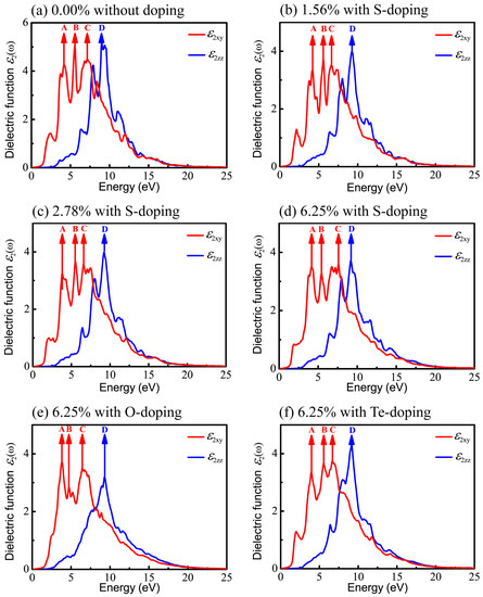 It is known that DFT within PBE generally underestimates the band gap of semiconductors and then results in inaccurate optical calculations; however, HSE06 used here can give reasonable predictions about optical properties compared to experimental results [62,63,67]. Therefore, all optical properties stemming from the consequences of the imaginary part of the dielectric functions are based on HSE06. Also, in order to have a comprehensive understanding of the relationship between optical properties and X-doping, we systematically calculated the imaginary part of the dielectric function under various doping conditions. The real () and imaginary () parts of the complex dielectric function in xy plane (parallel to the monolayer) and along the z axis for six different X-doping cases are presented in Figure 7 and Figure 8.