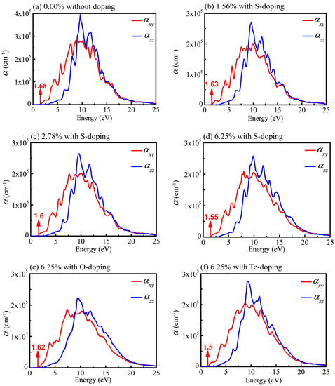 As can be seen from the curves of the absorption coefficient in Figure 9, the values decrease rapidly in the low-energy region, which is a conspicuous feature of the semiconductor and insulator. It is clear that the absorption coefficients in the xy plane () and along the z axis () show apparent disparity. Besides, the absorption spectra (Figure 9) for the six cases considered here display profiles in the whole wavelength range nearly the same as those of the undoped system. However, the intensities of peaks are slightly weakened in the doping system. This originates from the reduction in both and after doping as a consequence, leading to the weaker intensities of absorption peaks according to Equation (5). In any case, the results indicate that the optical properties are similar in the six systems.
