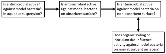 - Ojeil, M.; Jermann, C.; Holah, J.; Denyer, S.P.; Maillard, J.-Y. Evaluation of new in vitro efficacy test for antimicrobial surface activity reflecting UK hospital conditions. J. Hosp. Infect. 2013, 85, 274–281. [Google Scholar] [CrossRef] [PubMed]