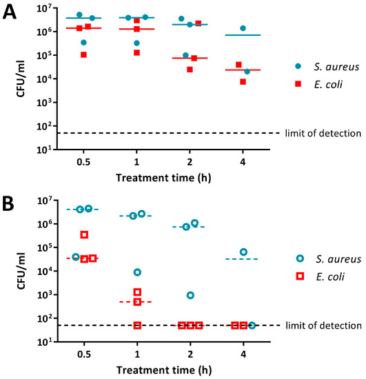 E. coli and S. aureus treated with PANI suspension were present at similar cell numbers at the earlier, 0.5 h and 1 h, time points (Figure 2A). For the later, 2 h and 4 h, time points E. coli was knocked down by 1 to 2 logs (measured as the difference between inoculum and the median number of viable cells remaining), while S. aureus cell numbers decreased by only ~0.5 log (Figure 2A). The overall difference in sensitivity between E. coli and S. aureus to 0.5% PANI suspension was statistically significant (linear regression analysis, intercepts are different, p value: less than 0.05).