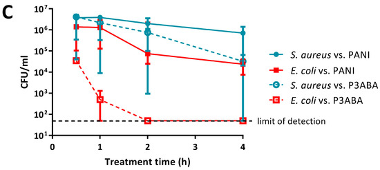 Both E. coli and S. aureus were more susceptible to P3ABA suspension when compared to PANI suspension (Figure 2). P3ABA suspension reduced E. coli viable cell numbers to below the limit of detection within 2 h, while S. aureus was knocked down by ~2 log following a 4 h exposure (Figure 2B; i.e., the difference between inoculum and the median number of viable cells remaining was about 2 logs, or 100-fold). As observed for PANI suspension, P3ABA suspension was more active against E. coli as compared to S. aureus (Figure 2B,C). The difference in susceptibility between E. coli and S. aureus to 0.5% P3ABA suspension was statistically significant (linear regression analysis, intercepts are different, p value: less than 0.05). These results confirm that PANI and P3ABA in suspension are active against the model Gram-negative and Gram-positive organisms tested and support investigation of their surface activity.