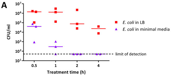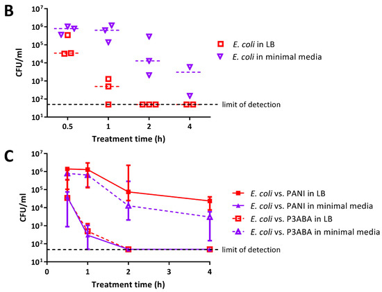 The antimicrobial activity of 0.5% PANI and P3ABA suspensions in rich and minimal media was determined against E. coli 25922 lux. PANI suspension mediated a greater reduction in the viable cell count in minimal media when compared to rich media (Figure 3A). E. coli in minimal media reached the limit of detection (~4 log reduction) after a 2 h challenge, while a decrease of ~1–2 log was observed in rich media after 4 h (Figure 3A). The greater activity of PANI suspensions against E. coli in minimal media when compared to LB broth was statistically significant (linear regression analysis; intercepts are different, p value: less than 0.05).