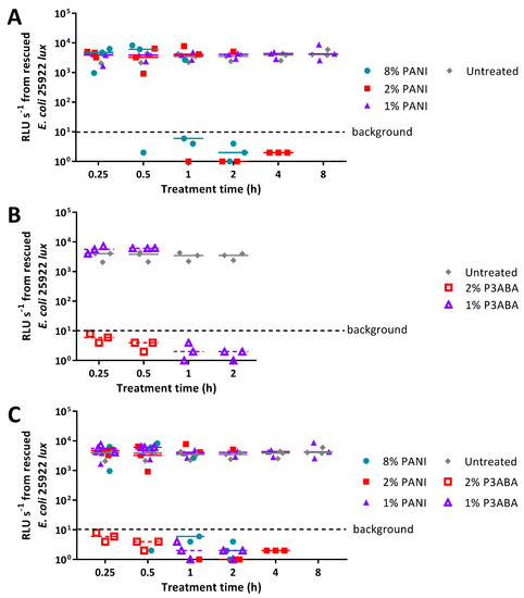 At specified time points, bacterial cells were rescued in 200 µL fresh media in a 96 well plate [95]. Each type of absorbent surface was tested for the necessary time to achieve knockdown, therefore, highly active surfaces were tested only for the shorter treatment times. E. coli 25922 lux and S. aureus 6538 were challenged with PANI in agar for the following treatment times: 15 min, 30 min, 1 h, 2 h, 4 h, and 8 h. E. coli 25922 lux was exposed to P3ABA in agar for the following treatment times: 15 min, 30 min, 1 h, and 2 h. S. aureus 6538 was exposed to P3ABA in agar for the following treatment times: 15 min, 30 min, 1 h, 2 h, and 4 h. The viability of rescued E. coli 25922 lux was assessed after 16 h incubation by measuring bioluminescence using the VICTOR X Multilabel Plate Reader (Perkin Elmer, Foster City, CA, USA). The viability of rescued S. aureus 6538 was determined by measuring OD600 using the µQuant™ Microplate Spectrophotometer (BioTek Instruments, Winooski, VT, USA). Three biological replicates were obtained for each experiment.