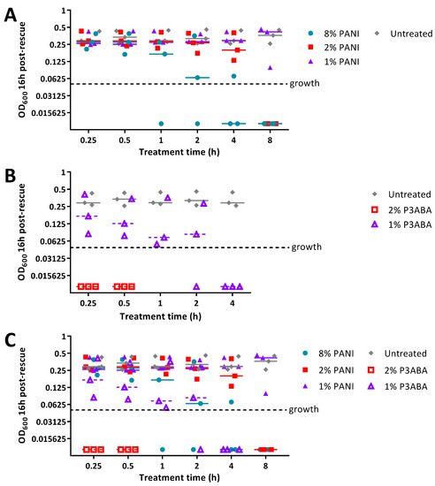 Sensitivity of S. aureus 6538 to PANI in agar. (A) ~104 CFU of S. aureus was exposed to 8% PANI, 2% PANI, and 1% PANI incorporated into LB agar for 0.25 h, 0.5 h, 1 h, 2 h, 4 h, and 8 h. (B) ~104 CFU of S. aureus was exposed to 2% P3ABA and 1% P3ABA incorporated into LB agar for 0.25 h, 0.5 h, 1 h, 2 h, and 4 h. Following treatment, the cells were rescued by washing the agar surface with LB broth and transferred to a 96 well plate. Each point represents the median of three technical replicates and each bar represents the median of each biological replicate. The data from A and B is combined for comparison in (C). The rescued cells were incubated at 37 °C for 16 h and optical density at 600 nm (OD600) was measured. The vertical axis shows the OD600 measurements from the recovered cells with each data point representing an independent experiment and the line representing the median. OD600 readings above 0.05 are considered as growth.