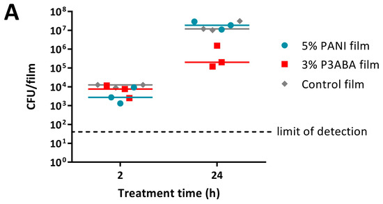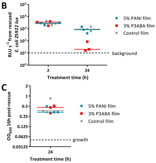 A turbid overnight culture of test bacteria was diluted to 106 CFU/mL in broth and enumerated. The activity of the PANI and P3ABA containing film samples was determined using the MSTA adapted from Japanese Industry Standard (JIS Z-2801) method [28,70]. A piece of film was placed in an empty well, inoculated with 10 µL of diluted culture, and a second piece of the same type of film was placed on top of the inoculum [28,70]. Film samples for background readings received 10 µL of LB broth. The film treatments were established in triplicate. At the specified time point(s) bacterial cells were rescued in 190 µL LB broth in a fresh 96 well plate [95]. The rescued cells were incubated at 37 °C in a sealed container with moist tissue for 16 h and the viability of rescued cells was determined [95]. Three biological replicates were obtained for each experiment.