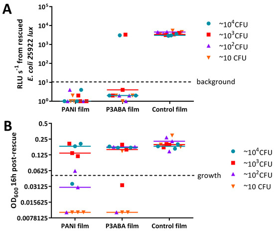 Activity of PANI and P3ABA films against a range of CFU doses of E. coli 25922 lux and S. aureus 6538. ~10 CFU–~104 CFU of E. coli (A) or S. aureus (B) in 10 μL 0.85% saline was sandwiched between two pieces of PANI film, P3ABA film, or control film for 2 h. The cells were rescued by washing the film samples with LB broth and transferred to a 96 well plate. The rescued cells were incubated at 37 °C for 16 h and light release (A) or OD600 (B) was measured. The vertical axes show the bioluminescence measurements (A) or OD600 (B) from the recovered cells with each data point representing an independent experiment and the line representing the median. Background luminescence readings are 10 RLU s−1. OD600 readings above 0.05 are considered as growth.