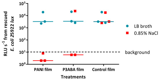 Activity of PANI and P3ABA films against E. coli 25922 lux in the presence and absence of organic matter. ~104 CFU of E. coli in 10 μL LB broth or 10 μL 0.85% saline was sandwiched between two pieces of PANI film, P3ABA film, or control film for 2 h. The cells were rescued by washing the film samples with LB broth and transferred to a 96 well plate. The rescued cells were incubated at 37 °C for 16 h and light release was measured. The vertical axis shows the bioluminescence measurements (RLU s−1) from the recovered cells with each data point representing an independent experiment and the line representing the median. Background luminescence readings are ~10 RLU s−1.