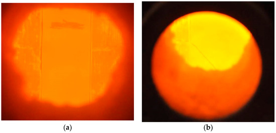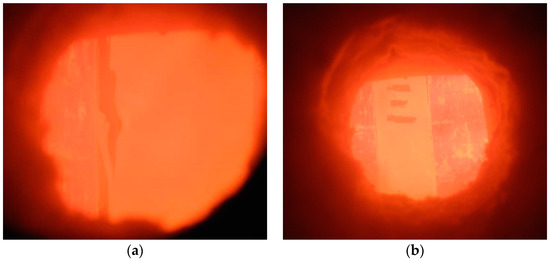 View of test specimen HSS-C2 through the observation window: (a) at about 10 min; (b) at about 25 min.