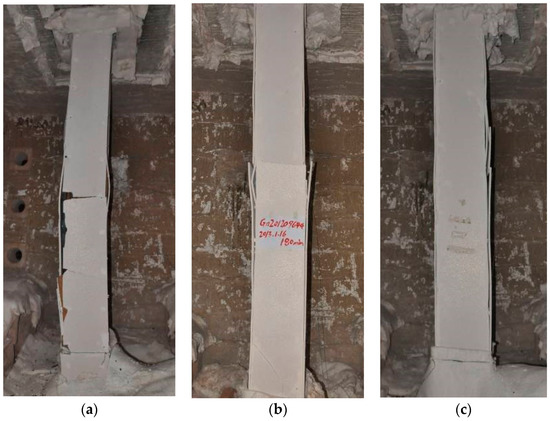 Columns after tests (still in the furnace): (a) HSS-C1; (b) HSS-C2; (c) HSS-C3.