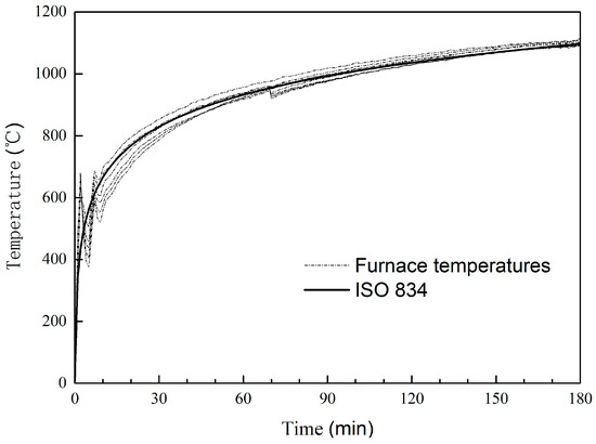 The measured furnace temperatures for specimen HSS-C2 are plotted in Figure 8 as an example. During the first 10 min, the temperatures had some oscillation. After 10 min, the average furnace temperature followed the standard temperature curve very well.