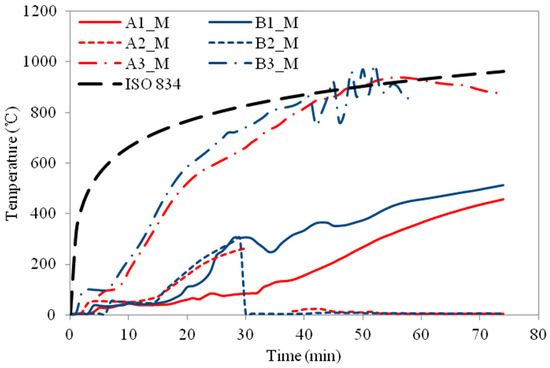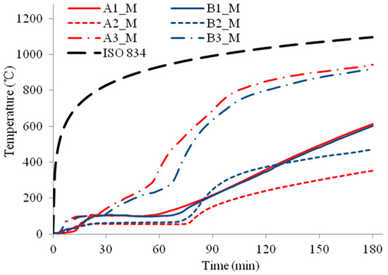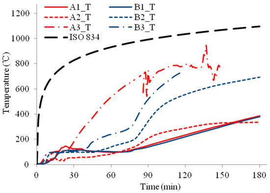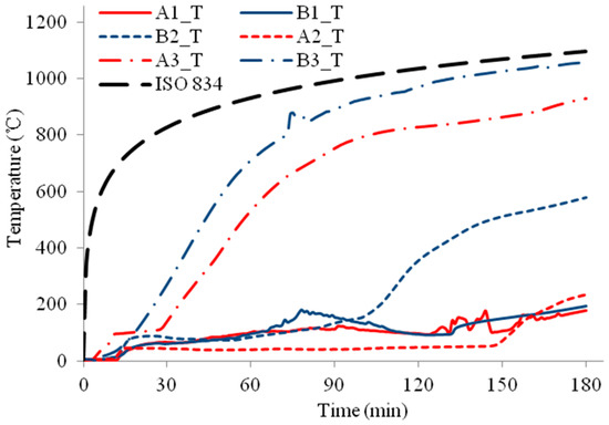 For specimens HSS-C2 and HSS-C3 protected with a double-layer of FRSC boards, temperatures between the boards and insulation (A3 and B3) had similar increase trends, as shown in Figure 11 and Figure 13. At 180 min, the furnace temperature was about 1100 °C and the A3 and B3 temperatures reached about 900~1000 °C (Figure 11, Figure 12 and Figure 13), which were less than the furnace temperature. This indicated that the boards did not break before 180 min and the rock wool did not experience direct exposure to the fire during the tests.