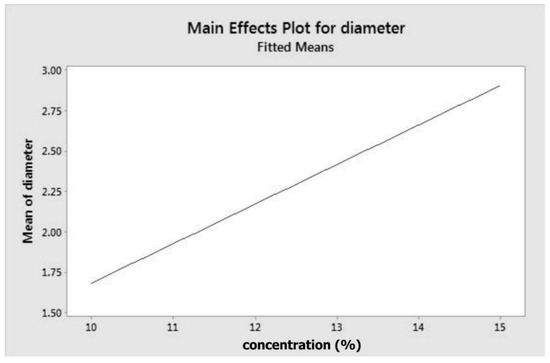 The model (Equation (1) and main effect plot (Figure 1)) indicate that concentration has a positive correlation with fibre diameter. To obtain fibres with smaller diameters, a lower concentration is required, as depicted by Figure 1. At minimum concentration, which is of 10% w/v, fibre diameter is around 1.7 µm. The equation or model proposed is only valid for the experimental conditions applied in this investigation and would need to be regenerated or refined for any addition or modification of the parameters.