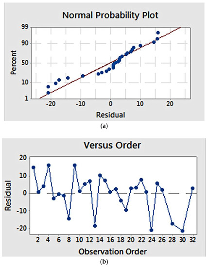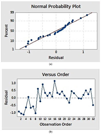 Validity of the model estimation was examined using a normal probability plot and residual versus observation order plot (Figure 6). The normal probability plot (Figure 6a) showed that the residuals pattern followed a straight line, suggesting a normal distribution of residuals. Meanwhile, the plot of residuals versus order (Figure 6b) suggests that estimation errors were not related to the order of observation, as the residuals showed a random pattern